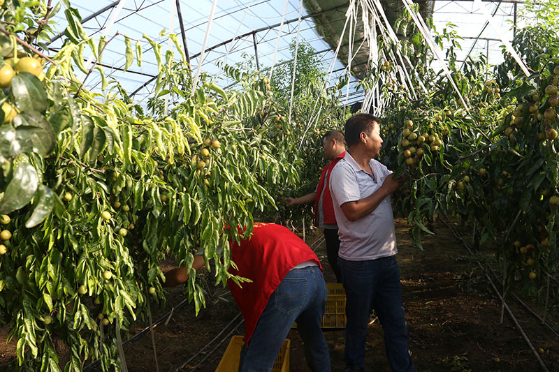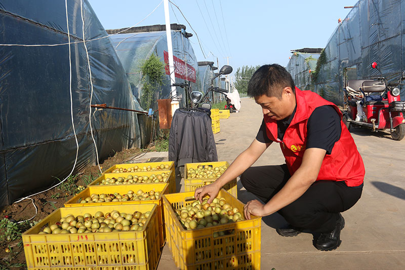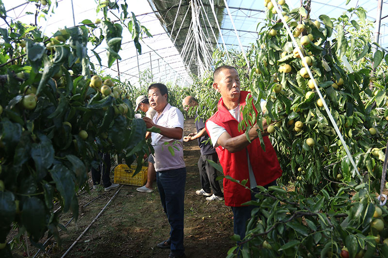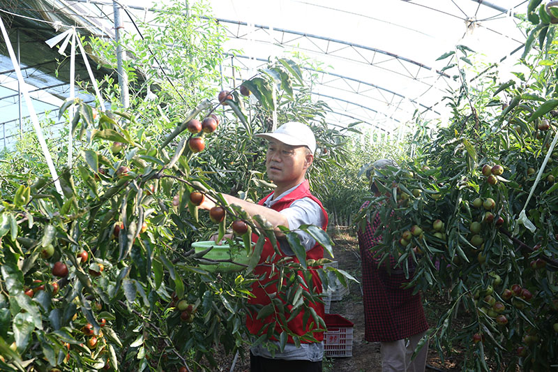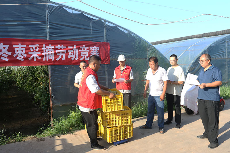 党员示范促发展 劳动竞赛掀热潮时间:2025-08-13 8月13日,陕西农垦朝邑农场冬枣园内,争先锋、站排头、挑重担,一场在党员责任区内,由党员干部发挥模范带头作用的劳动竞赛在此拉开帷幕。来自6个生产班组的30名职工化身 “摘枣能手”,在田间地头展开了一场兼具速度与精度的劳动比拼,此次竞赛不仅是一场体力与技巧的较量,更是对丰收喜悦的尽情分享。 清晨的冬枣园薄雾未散,挂满晨露的冬枣如红宝石般点缀枝头。红彤彤的冬枣挂满枝头,在绿叶的映衬下显得格外诱人。参赛选手们早早来到现场,个个摩拳擦掌,跃跃欲试。随着一声清脆的哨响,采摘劳动竞赛正式拉开帷幕。选手们迅速冲向各自的采摘区域,瞬间,园子里充满了紧张而热烈的氛围。他们5人一组,分工明确,配合默契,小心翼翼地将冬枣从枝头摘下,尽量避免损伤果实。